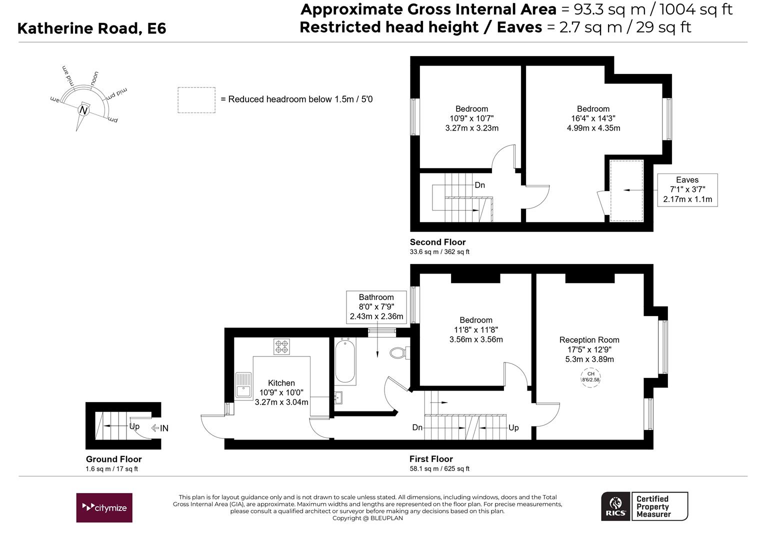Offering a generous Gross Internal Area of 93.3 sq m (1,004 sq ft), the accommodation is arranged over two floors. The current layout includes a kitchen, bathroom, one bedroom, and a reception room on the first floor, with two further bedrooms on the upper level. There is room to add value over time.