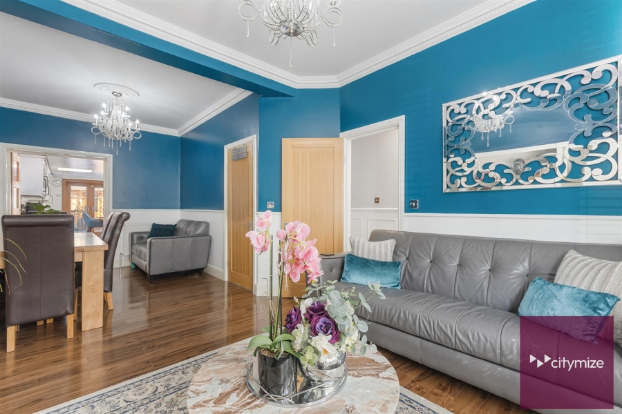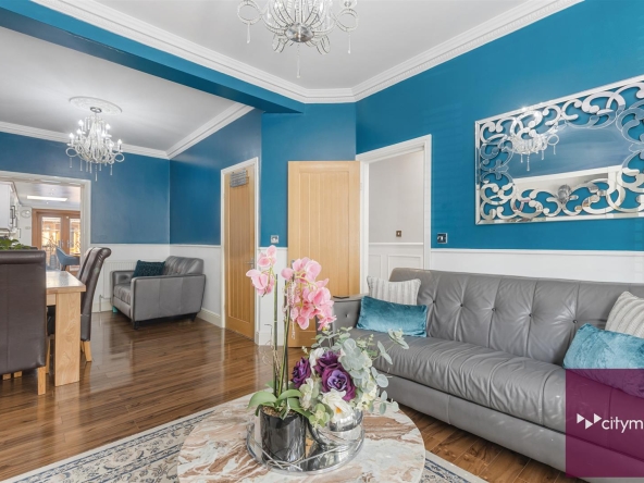 The inviting reception room is generously proportioned, featuring polished laminate flooring and abundant natural light, creating an ideal space for both relaxation and entertaining.